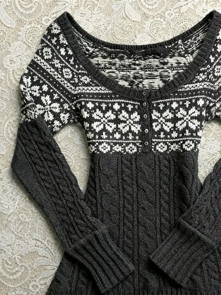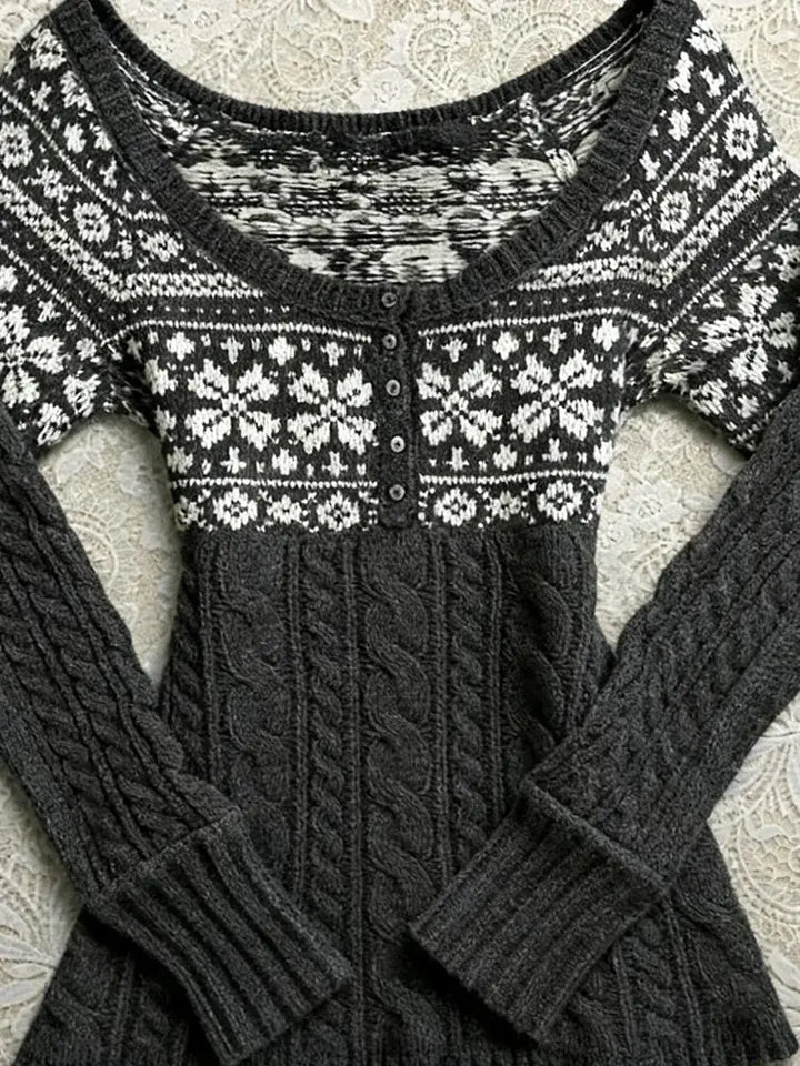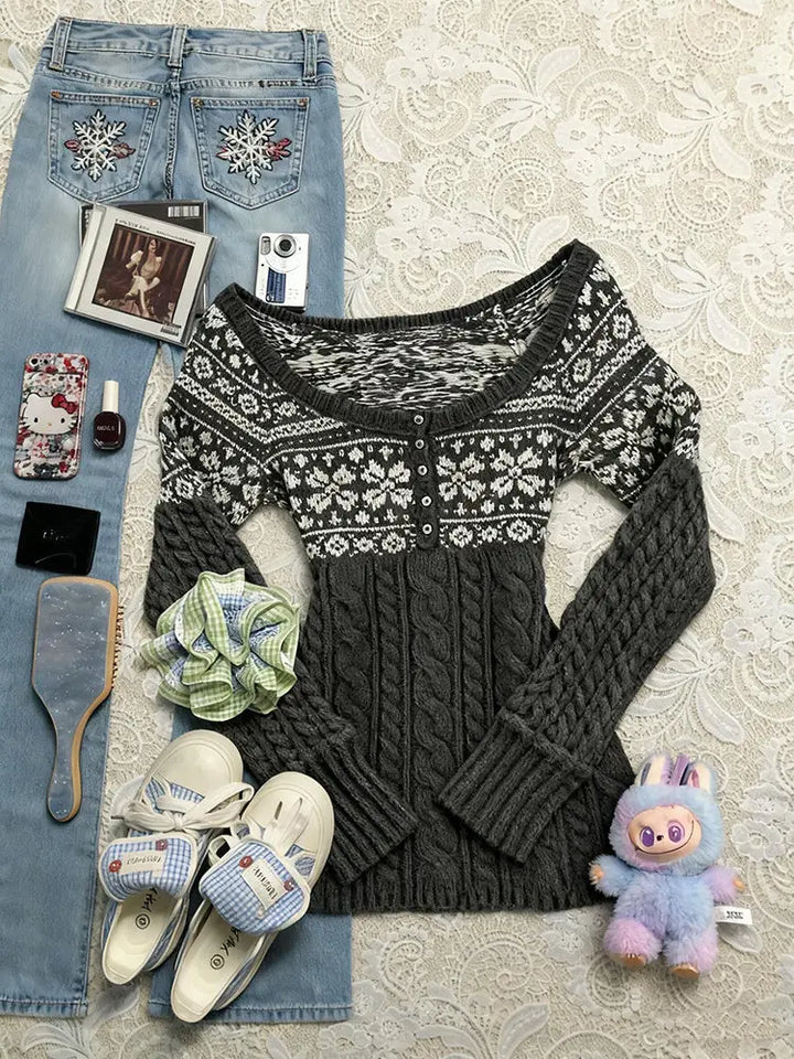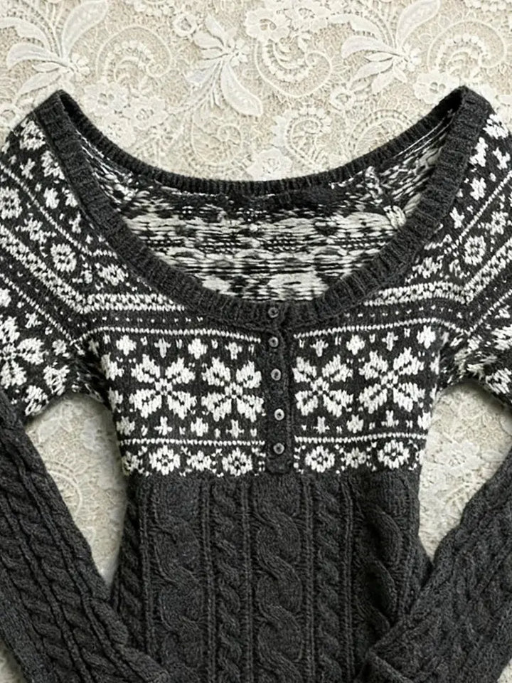 Grey jacquard crew neck knit cardigan
