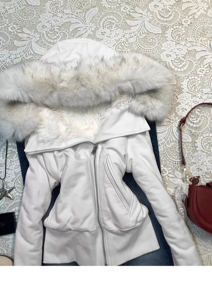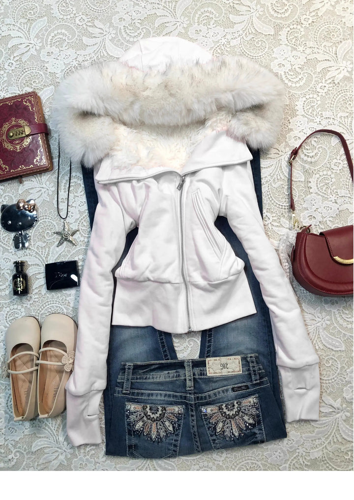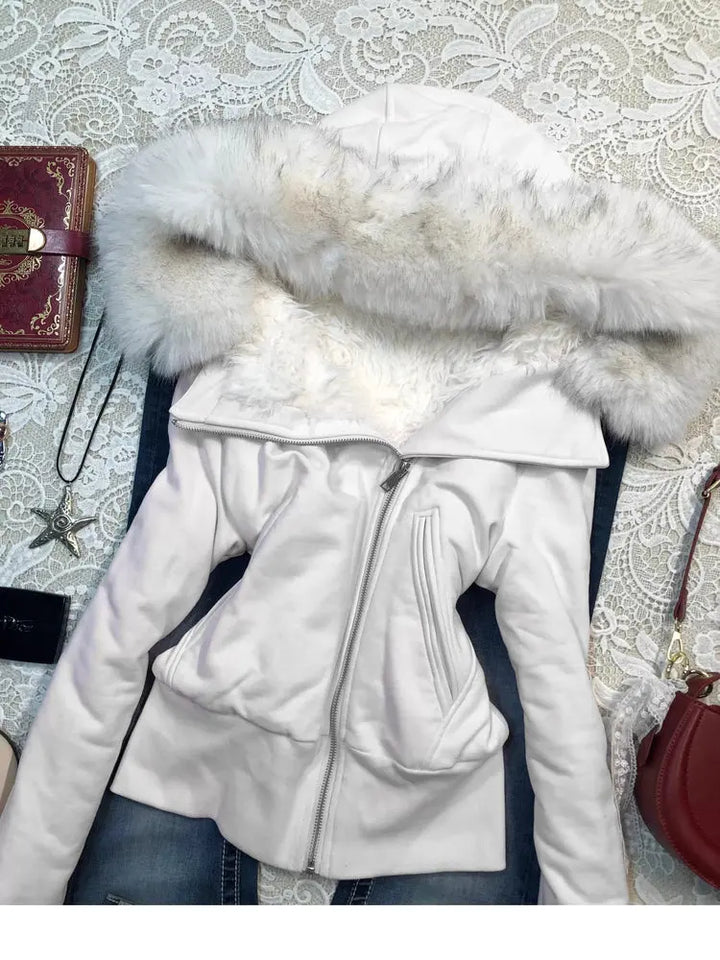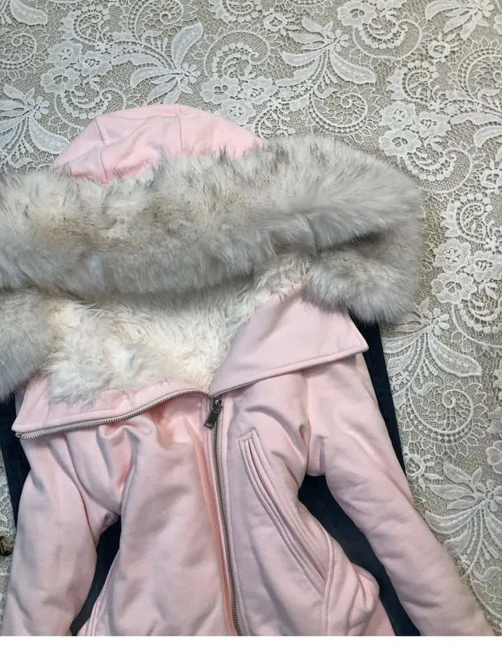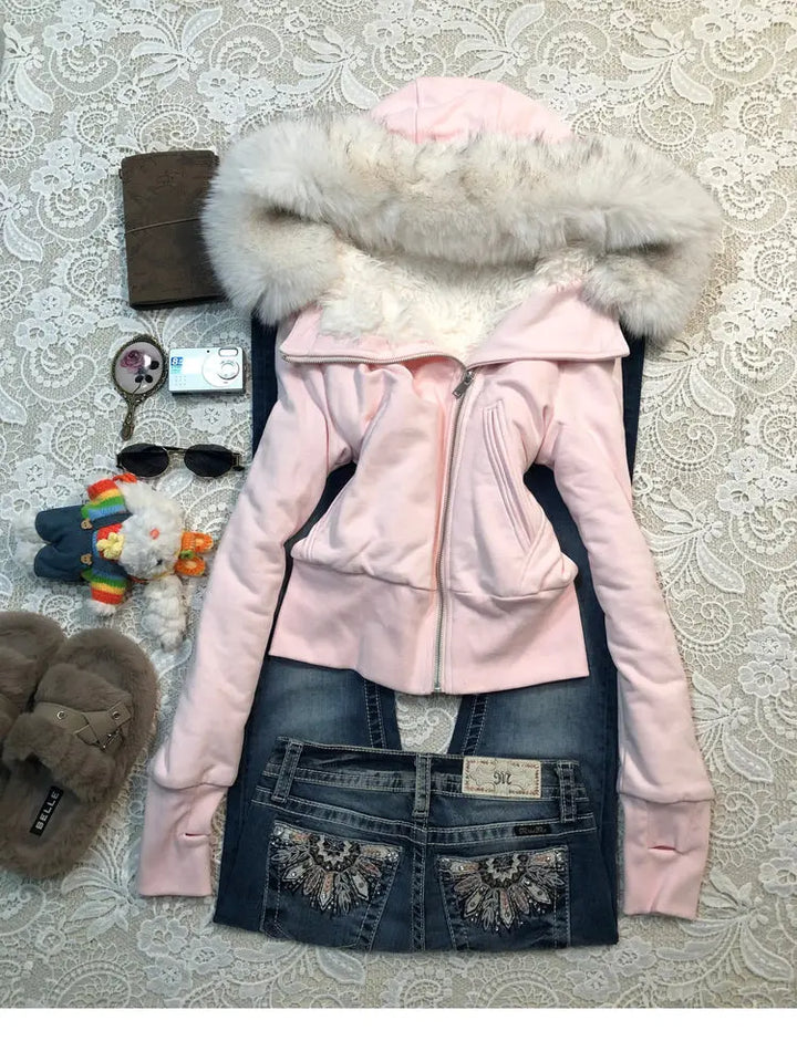 Pink fleece-lined thick hooded sweatshirt with fur collar