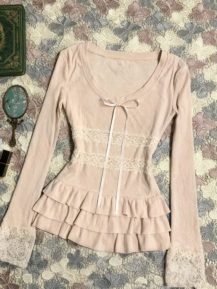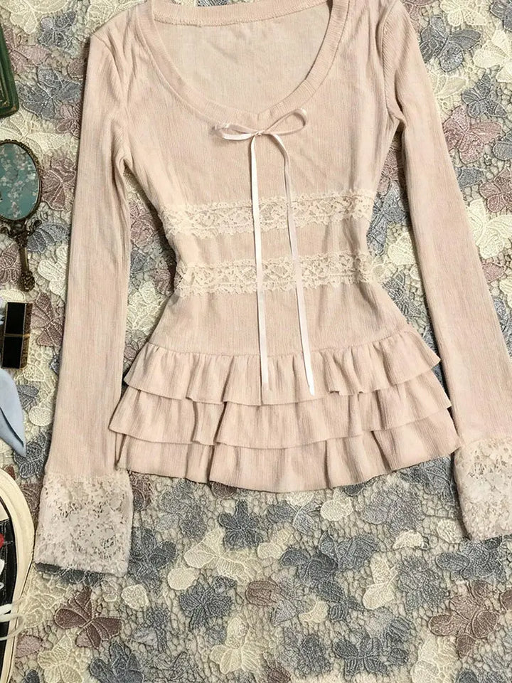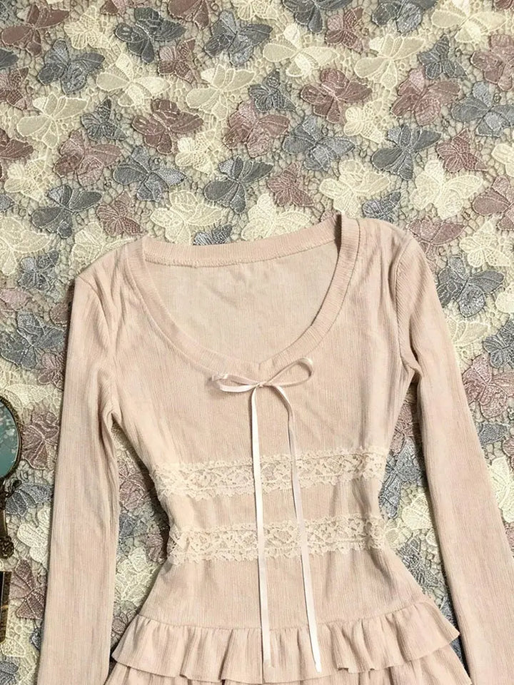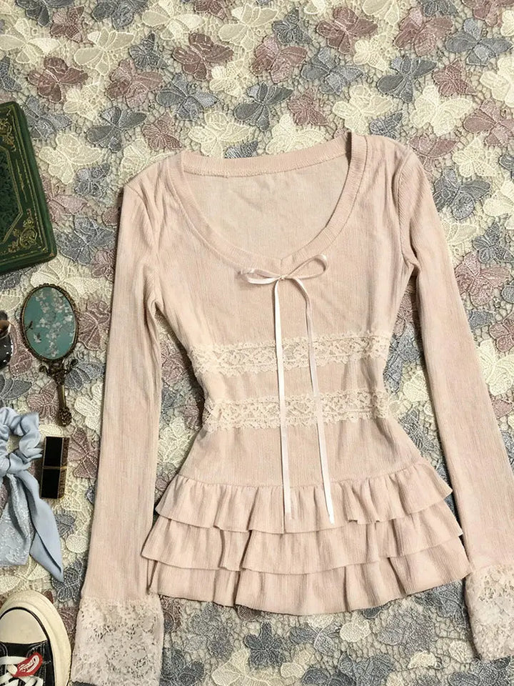 Pink patchwork lace long-sleeved T-shirt
